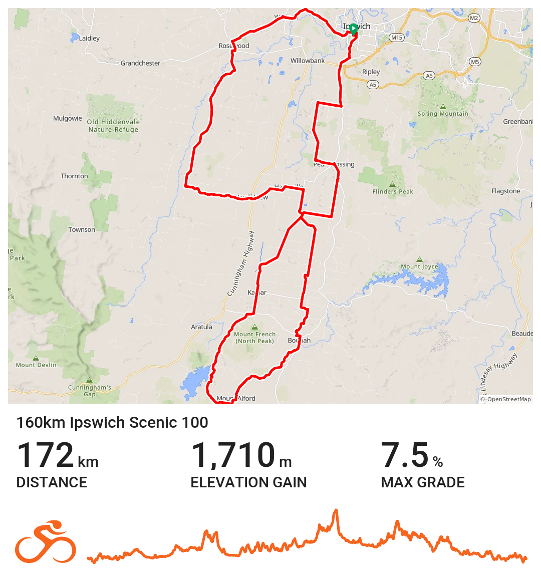 The 160km Challenge is an iconic event attracting the fittest cyclists from Southeast Queensland and beyond. It provided just the right mix of long flat sections and mild to moderate gradients (2 at 4% and 1 at 5%) to provide an experience well worth the training.